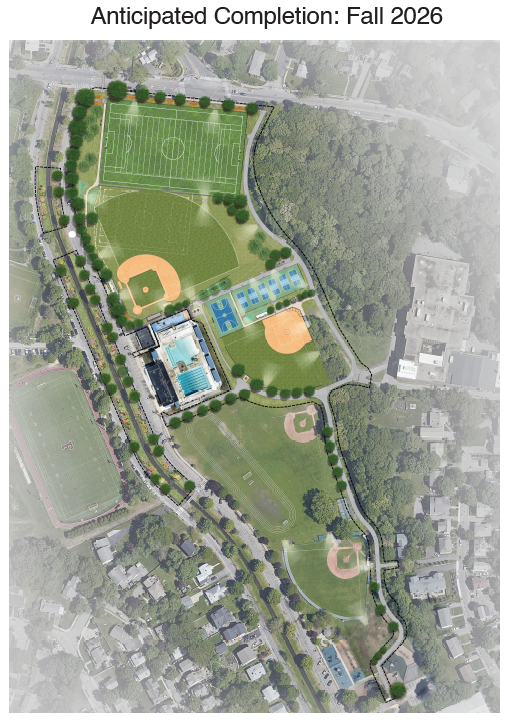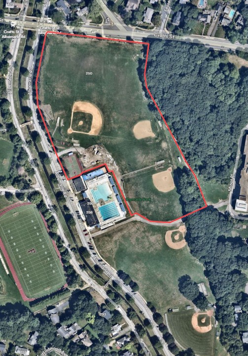 Newton’s Director of Parks & Open Space, Luis Perez Demorizi, recently announced that construction has begun on Phase 1 of the improvements scheduled for Albemarle Field. When he presented updated plans for Albemarle and other fields in a webinar last March (see Fig City News article), he indicated that construction on Phase 1 would begin in the winter of 2025. Construction fences are now going up (see aerial photo), and equipment and materials are arriving, on schedule.