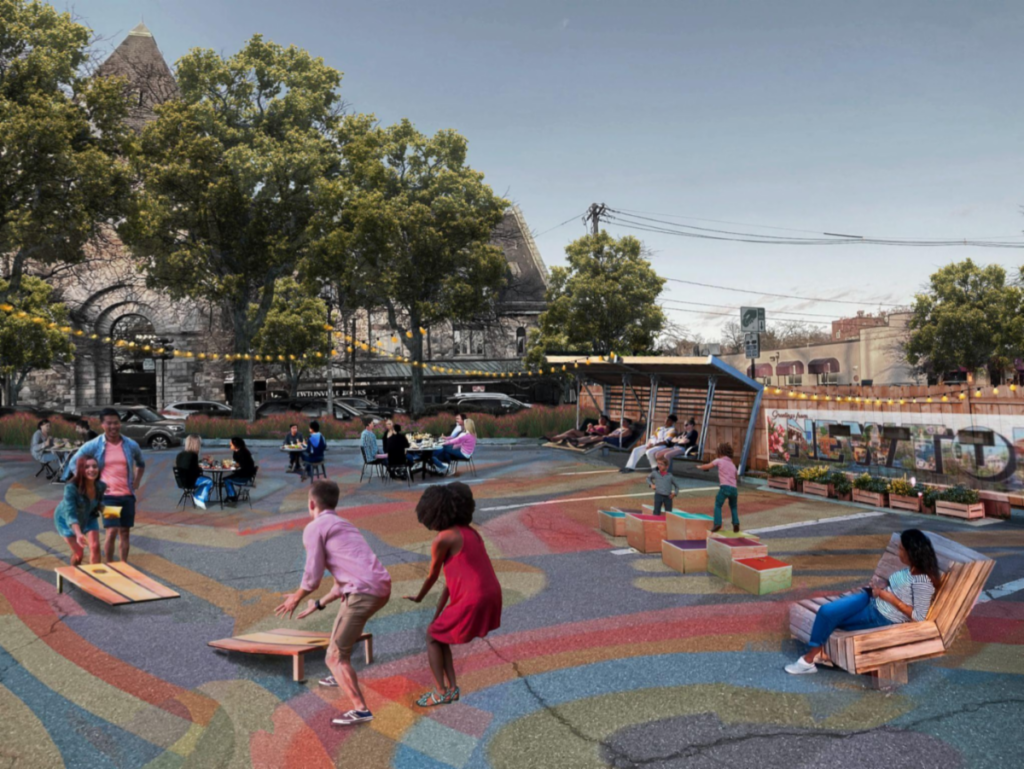 Artist’s conception of a new Community Plaza proposed for the western part of the triangle parking lot in Newton Centre. Community engagement for a design is scheduled to start in February. (image: City of Newton)