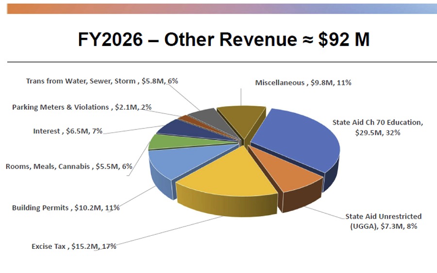 The Mayor then detailed the City’s projected revenues for Fiscal Year 2026, which are expected to total $548 million, with 83% coming from property taxes. The largest other sources of revenue are state aid, excise taxes, and building permits.