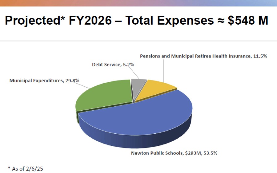 On Thursday February 6, Mayor Ruthanne Fuller met with the Newton City Council to begin informal discussions on the City’s FY 2026 budget, covering the year starting July 1, 2025. The meeting, described as a “Mayoral Listening Session,” took place at the Allen House. The Mayor was flanked by Newton’s Chief Operating Officer (COO) Jonathan Yeo and Council President (and mayoral candidate) Marc Laredo. Mayor Fuller is not seeking re-election in November.