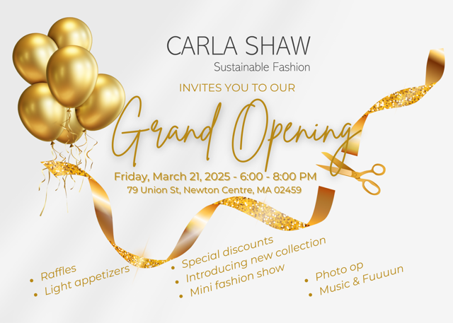 Carla Shaw will hold its Grand Opening on Friday, March 21, 6PM-8PM, with raffles, discounts, appetizers, music, and a mini fashion show.