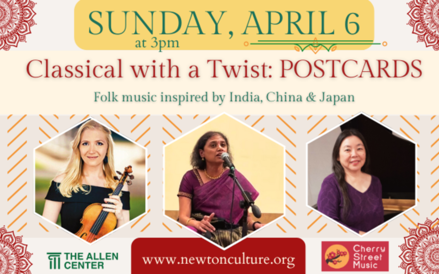 Cherry Street Music will present Classical with a Twist: Postcards on Sunday, April 6 at 3PM at The Allen Center (35 Webster Street, West Newton). Find tickets here.