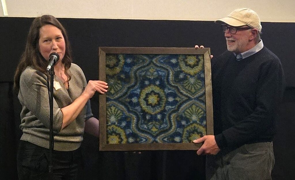 WNCF board member Jill Bellio, who has frequented the West Newton Cinema since she was a teenager and later a WNC employee, awarded David with a gift and a commemorative plaque to hang in the theater. WNCF Board President Elizabeth Heilig paid tribute to Bramante, presenting him with a framed swatch of the theater’s original lobby rug.