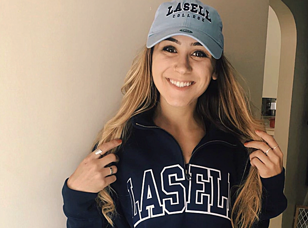 Juliana Pasquarosa in a hat and sweatshirt of her alma mater, Lasell College. (Photo: Carl Pasquarosa)