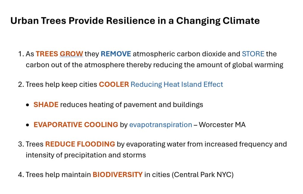 Moomaw said that urban trees provide many benefits in addition to storing carbon. They provide shade that can cool sidewalks and buildings, they reduce flooding by evaporating water, and they help maintain biodiversity.