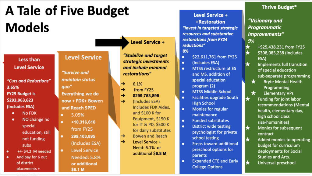 Dr. Nolin said that before assembling a budget model, her team spoke with principals and department heads across the district. After reviewing their requests, Nolin compiled what she called a “thrive budget,” containing “visionary and programmatic improvements.”