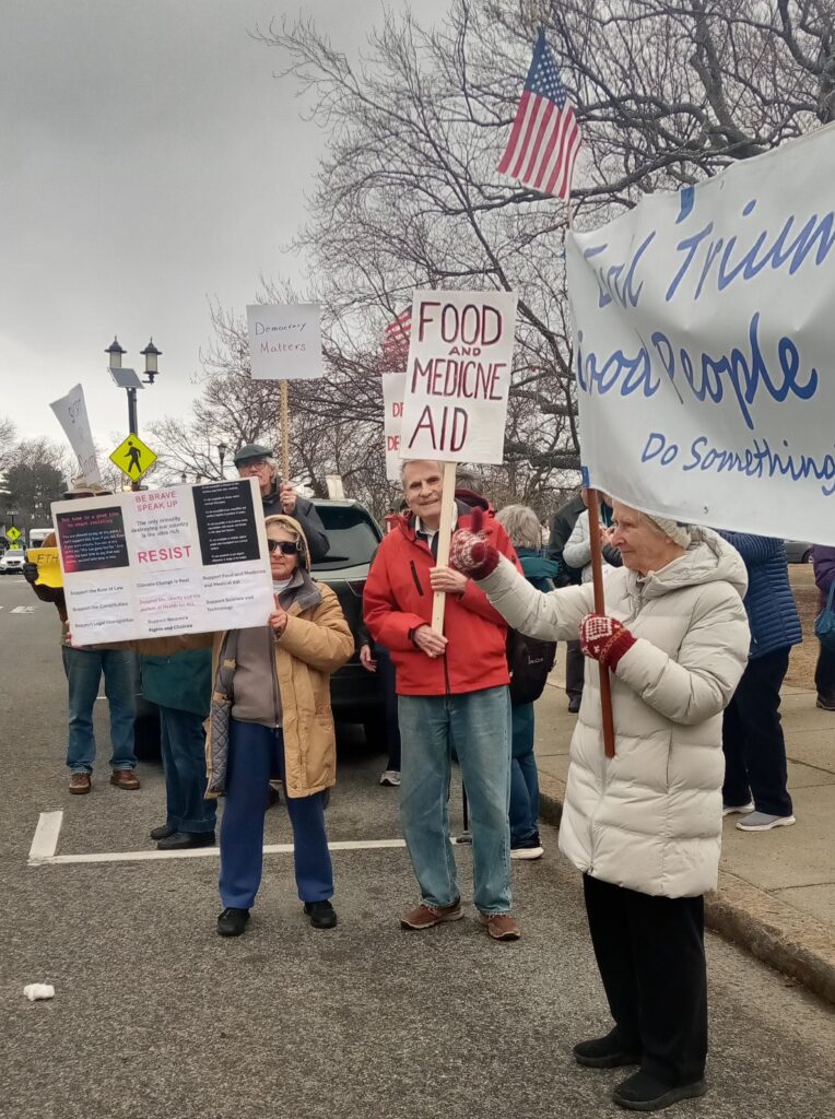 On a dreary, overcast March 1st, Newton Centre suddenly became the lively, colorful destination for Octogenarians on the March. Approximately 50 people carrying homemade signs gathered at a table under large banners – one quoting Edmund Burke: “Evil Triumphs when Good People Do Nothing” and another, ”Do Something! Stand with us!”