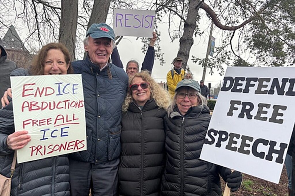 “The last few months have been horrible for so many of us,” Susan Davidoff told the Fig City News, noting “the frightening rate at which Trump and Musk were solidifying their power.” She explained that Nadine Cohen, a lawyer specializing in civil rights and fair housing, felt that people needed to be on street corners holding signs, and so the standouts became a reality. “Sometimes, when you don’t know what to do, get out and stand on a corner,” she said. Ms. Weissberg said that for the first standout, they sent emails to 100 people. Many of the recipients belonged to various local organizations. Ms. Cohen supplied signs for people who wanted them.