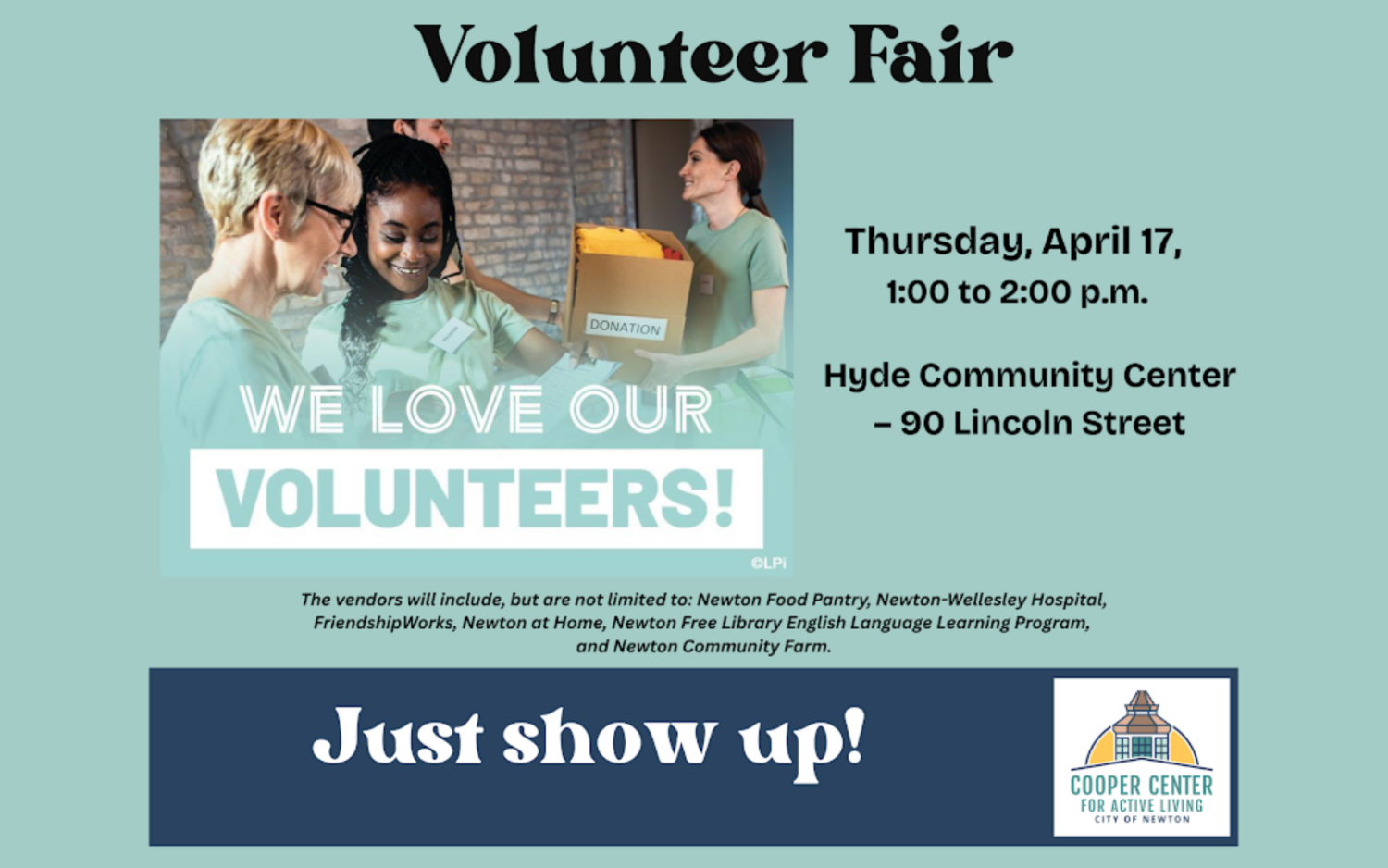The Cooper Center for Active Living will host a Volunteer Fair for those who are interested in helping others and making a difference. Participants can meet representatives from organizations around the city and learn about available volunteer opportunities. Vendors will include (but are not limited to): Newton Food Pantry, Newton-Wellesley Hospital, FriendshipWorks, Newton at Home, Newton Free Library English Language Learning Program, Newton Community Farm. It will take place on Thursday, April 17, 1-2PM at the Hyde Community Center (90 Lincoln Street, Newton Highlands).