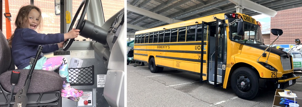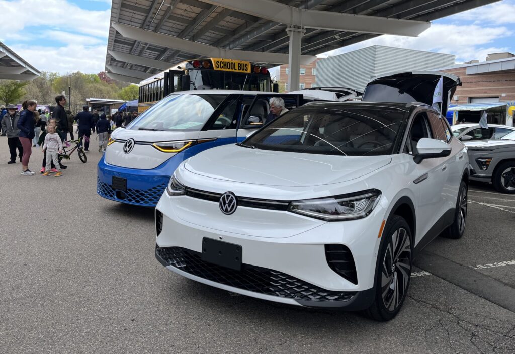 Doherty’s bus was part of an electric vehicle (EV) display outside Newton North High School, offering information to visitors who could also get a close-up look at several models.