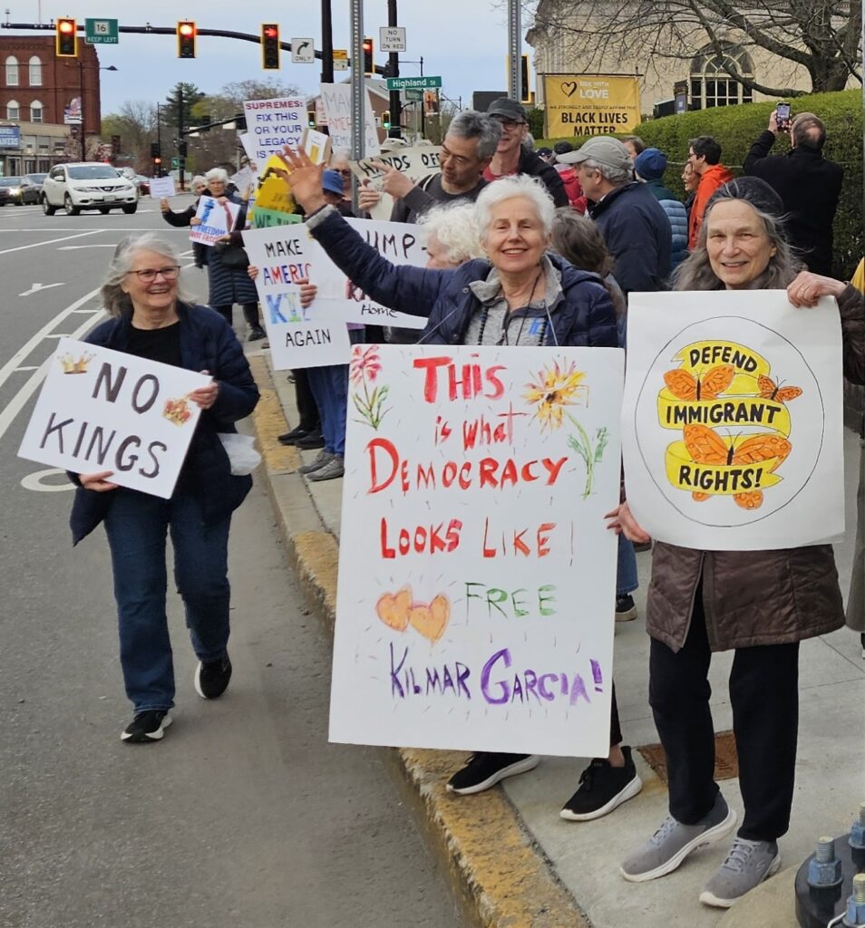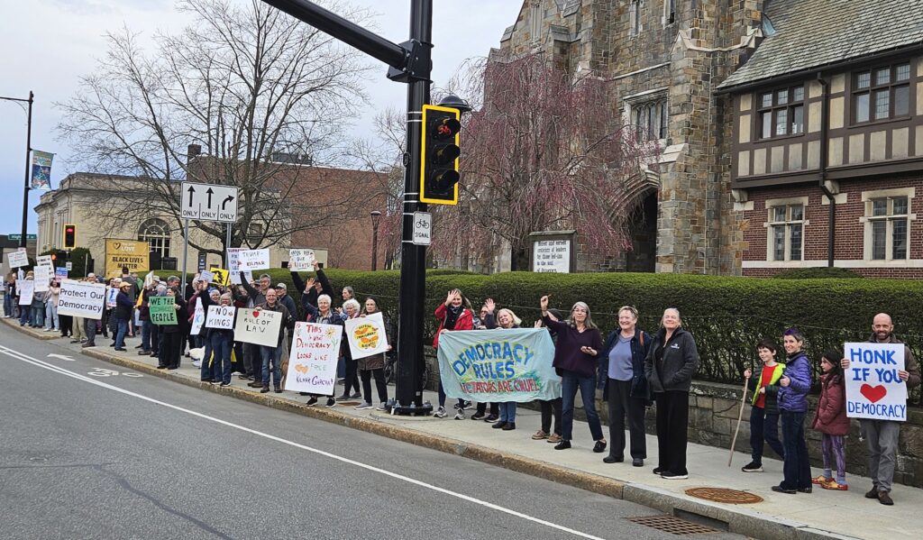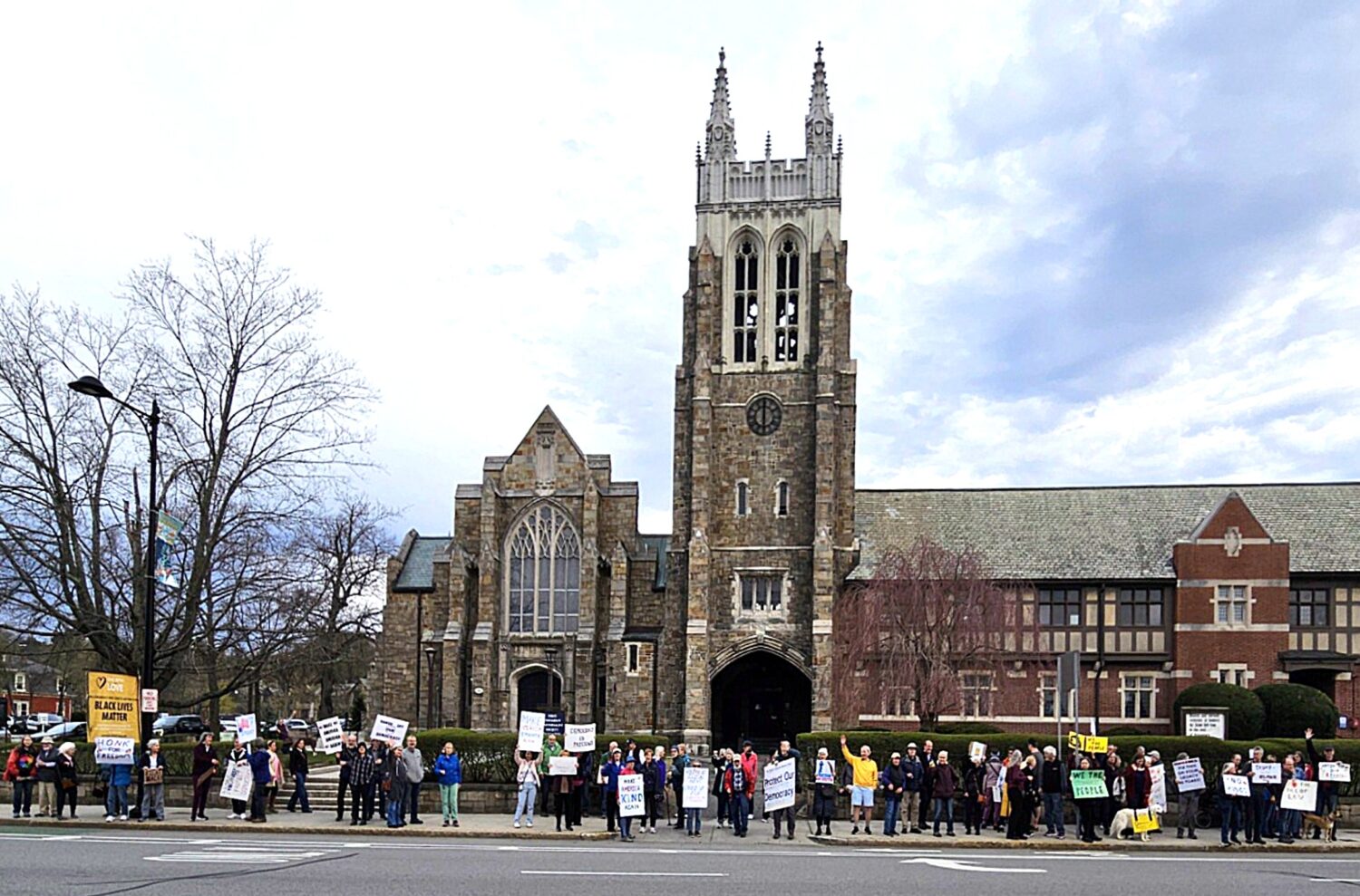 FUUSN’s co-ministers, Rev. Dr. Debra Haffner and Rev. Joel Miller, invited the congregation to line the sidewalk in front of the church and bring signs and bells to draw attention the continuous need to protect democracy and stand against tyranny. While about 50 were expected, almost 100 came.