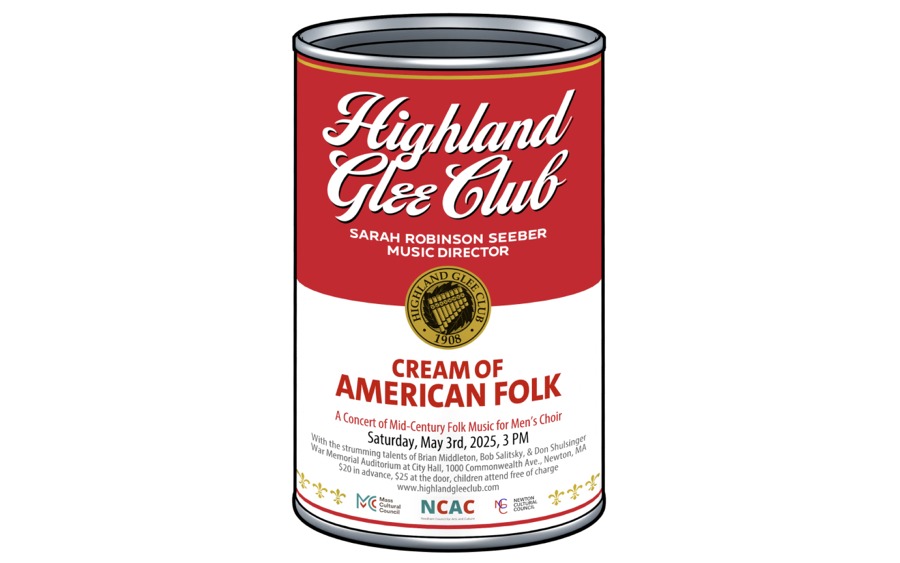 The Highland Glee Club will host a concert, Cream of American Folk, featuring 2025 Music Prize winner, high school senior, and classical pianist Henry Tushman. Participants are invited to bring a can of soup to give to the Newton Food Pantry. It will take place on Saturday, May 3 at 3PM at Newton City Hall (1000 Commonwealth Avenue, Newton Centre). Tickets are $20.