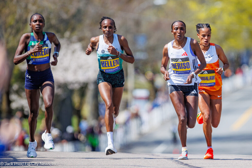 Sharon Lokedi (left) defeated 2024 champion Helen Oberi (2nd from left) to win the 2025 Boston Marathon.
