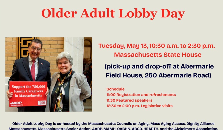 Older Adult Lobby Day is co-hosted by the Massachusetts Councils on Aging, Mass Aging Access, Dignity Alliance Massachusetts, Massachusetts Senior Action, AARP, MAMH, OABHN, ABCD, HEARTH, and the Alzheimer’s Association.