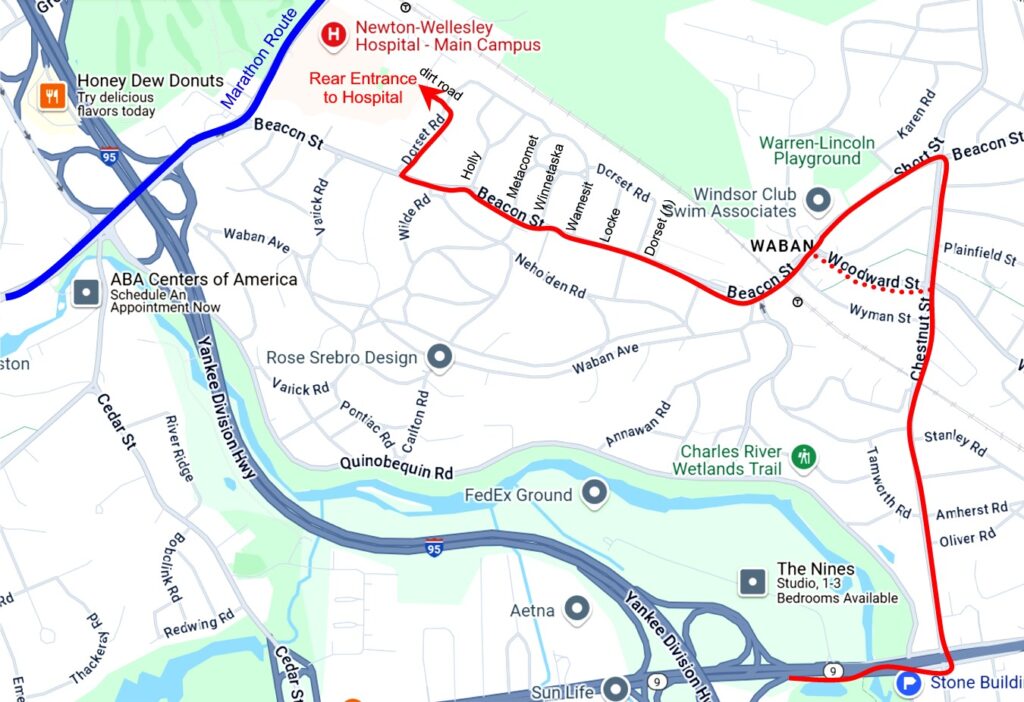 Newton-Wellesley Hospital is on the Marathon route, so access to the front will be inaccessible. The Newton Police Department provided these directions to the back entrance of Newton-Wellesley Hospital via Dorset Road: