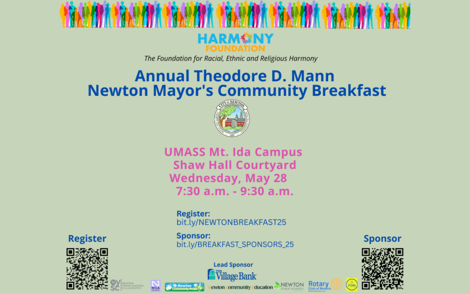The Mayor’s Community Breakfast is hosted annually by the Harmony Foundation and sponsored by The Village Bank and other partners. This year marks the 51st annual event in the series. Participants can register, or sponsor the event. It will be held on Wednesday, May 28, 7:30-9:30AM, on the UMass Amherst Mt. Ida Campus (100 Carlson Avenue, Oak Hill), in the Shaw Hall Courtyard (map).