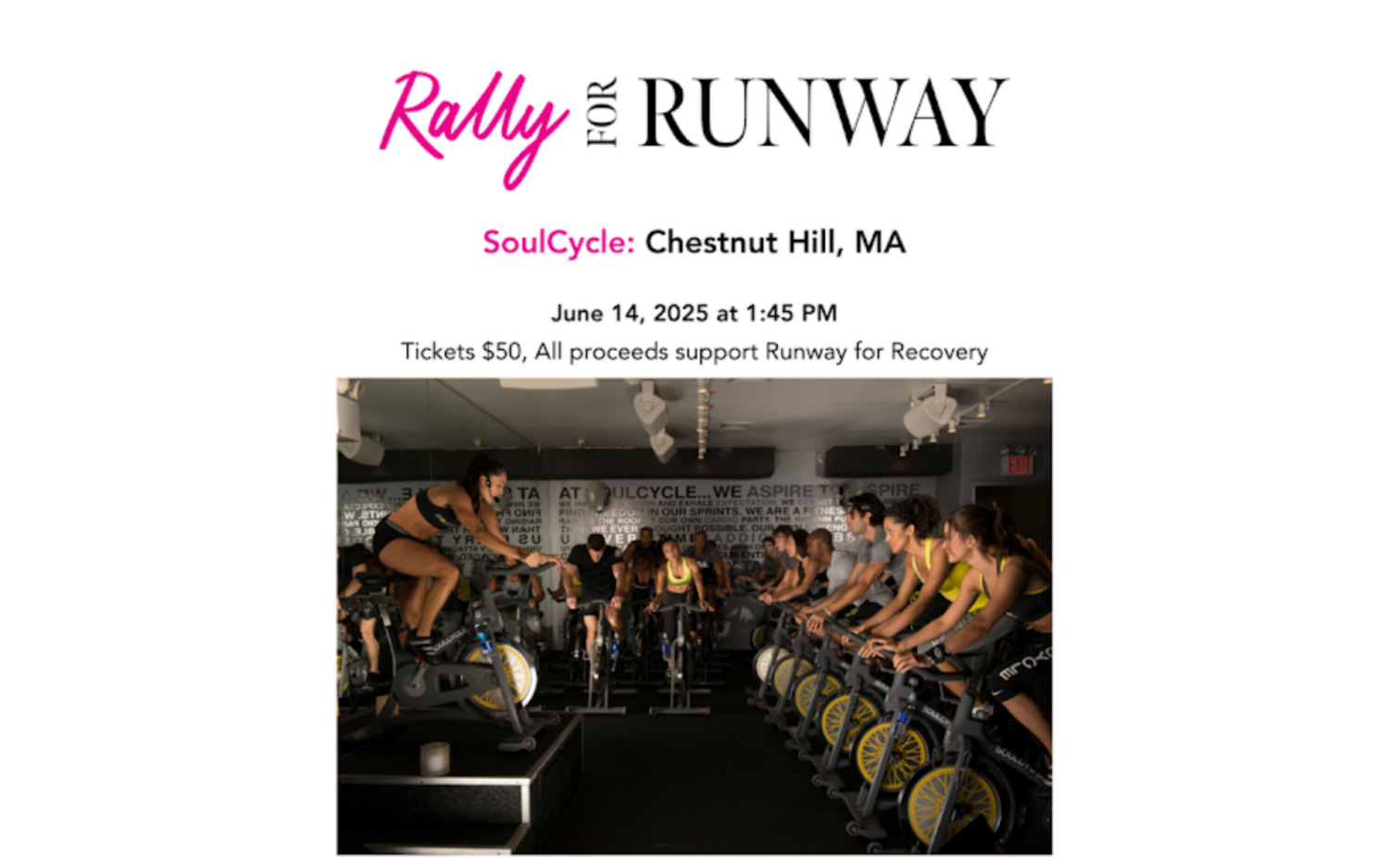 Runaway for Recovery and SoulCycle will host a Rally for Runaway, a Breast Cancer Nonprofit Charity Fitness Class to benefit Runway for Recovery. It will take place on Saturday, June 14, 1:45-2:30PM at SoulCycle (200-230 Boylston Street, Chestnut Hill). Registration is required.