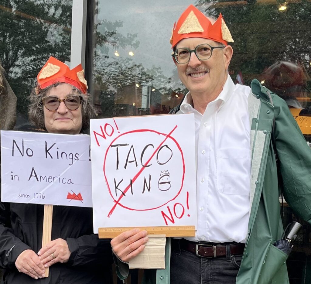 “I think this military parade … is outrageous,” especially after Trump has pushed to cut more “positive programs,” said Newton resident Ricky Greenly. She and her husband, Rob Greenly, wore handmade crowns adorned with triangular tortilla chips that symbolized a “TACO” meme (“Trump Always Chickens Out”).