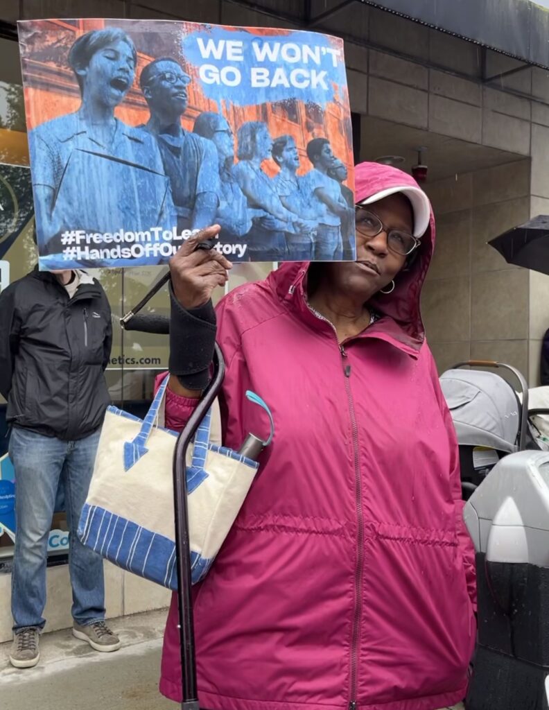 Clasping a sign that said, “We won’t go back,” Oak Hill teacher Carol Bolton Kappel said, “Our democracy is in danger. … [The] only way the tides are going to shift is if we stand up.”