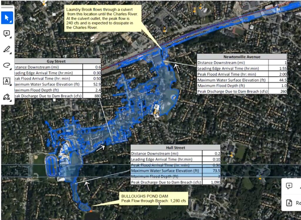 Were the dam to breach, it would send a wall of water downstream—and in its path would be Newton North, Cabot School, and over 450 homes.