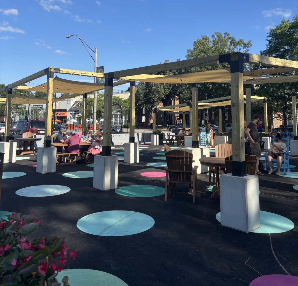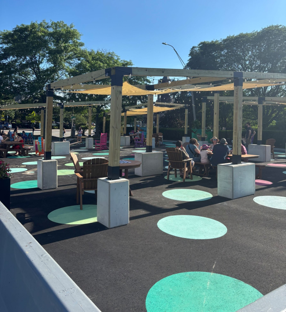 Newton Centre’s plaza offered countless games and activities—Chess, Beanbag Toss, and Connect Four— for people of all ages to enjoy while younger kids drew on the sidewalk. Newton Centre’s plaza is located in Langley Lot and is a temporarily refashioned part of the parking lot where people can gather and appreciate the village center.