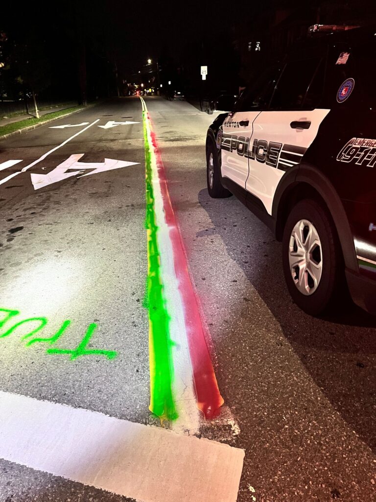 [UPDATE] At 2:23AM on Wednesday, July 16, Newton Police noted that approximately forty feet of the double-yellow line on Adams Street had been spray painted green, white, and red, and officers encountered a local resident tossing cans of spray paint into a bag. The fifty-four year old male resident of Nonantum told the arresting officers that he was “painting a tribute” on the street. He was charged with felony defacing of public property and was then released. No date has been set for his