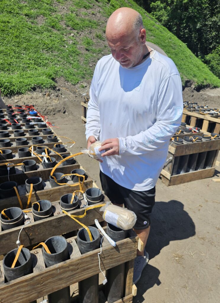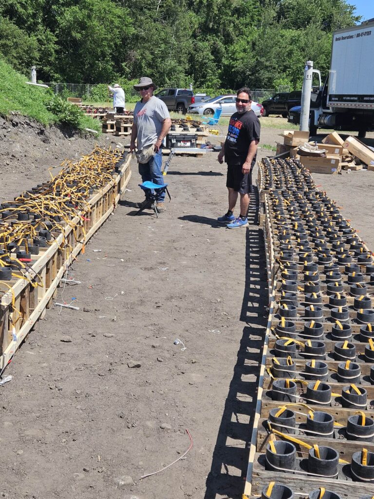 Another long-time crew member, Tom Rebenklau, who has worked with Tony since 1982, explained how the crew connects each shell to a fuse made of black-powder-infused string inside a weather-resistant wrapping, then places the shell in one of 1,500 mortar tubes. Each fuse is then connected to an electric igniter, which is connected by a wire to the control panel. It’s a lot of wires to manage.