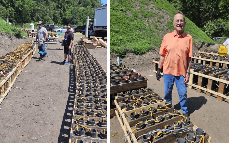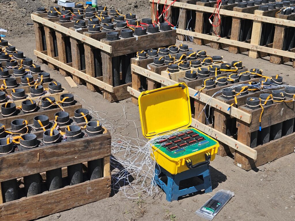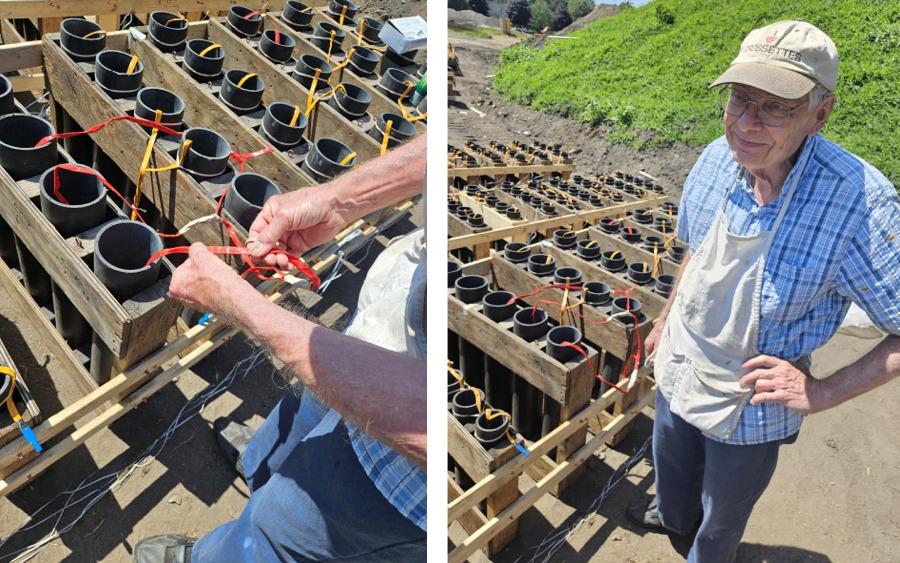Long-time crew member Tom Rebenklau walks through red and yellow fuses connected to white ignition wires. (photo: Bruce Henderson)