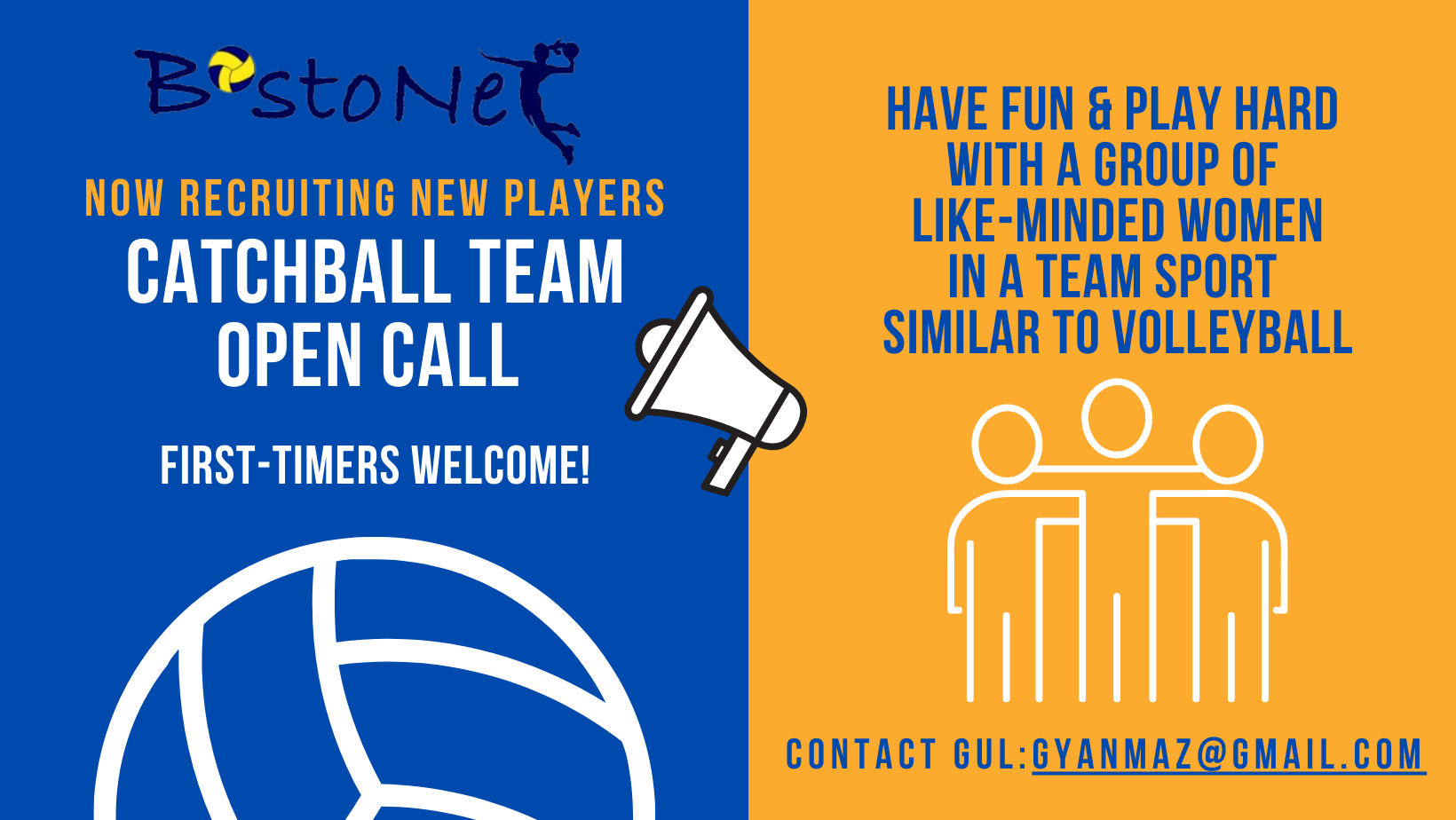 Catchball is a women’s game very similar to volleyball but a lot easier to learn and play. If you can catch a ball, you can play catchball! Bostonet Catchball plays Tuesday evenings in Newton and is recruiting a few more new players. No experience or athleticism is necessary, although some knowledge of volleyball helps. Most of the players are women in their 40s and 50s. Come check it out! To give it a try for free, go to bostonet.org/register/ and fill out the form under the heading “New to Bostonet.” Or email Gul at [email protected] for more information.