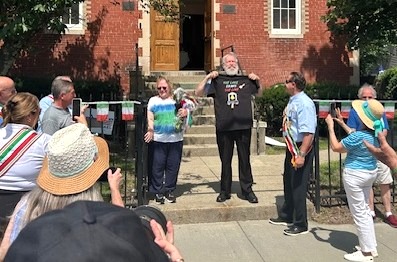 St. Mary of Carmen Society procession pauses in front of Adams Street Shul to present tricolor bouquet to Congregation president Beri Gilfix and Nonantum T-shirt to former treasurer Jordan Lee Wagner.