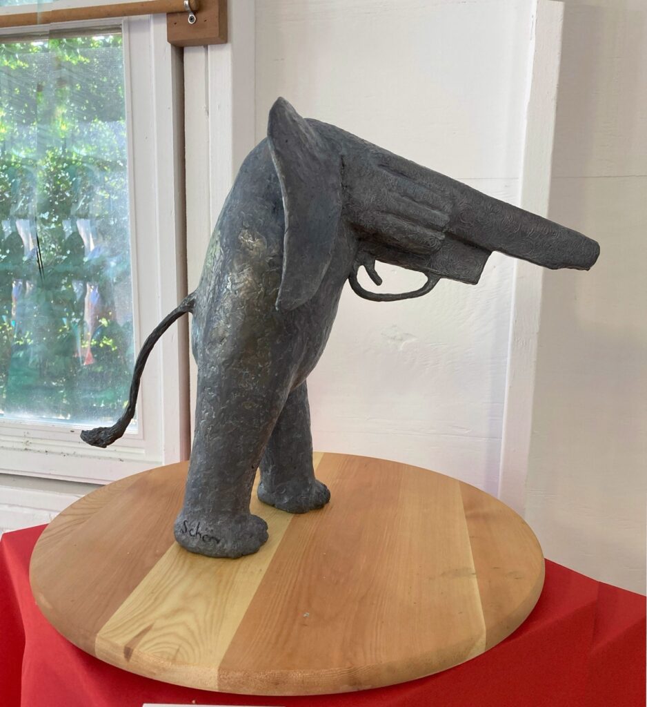 Another sculpture, Guns, also relies on political animal imagery. Though Schön said it was hard for her to pick a piece that she found the most fulfilling to work on, she pointed to Guns as a way to communicate her anguish over the state of gun-control legislation. “I believe the elephant with his gun speaks about how the gun lobby has taken over,” Schön said.