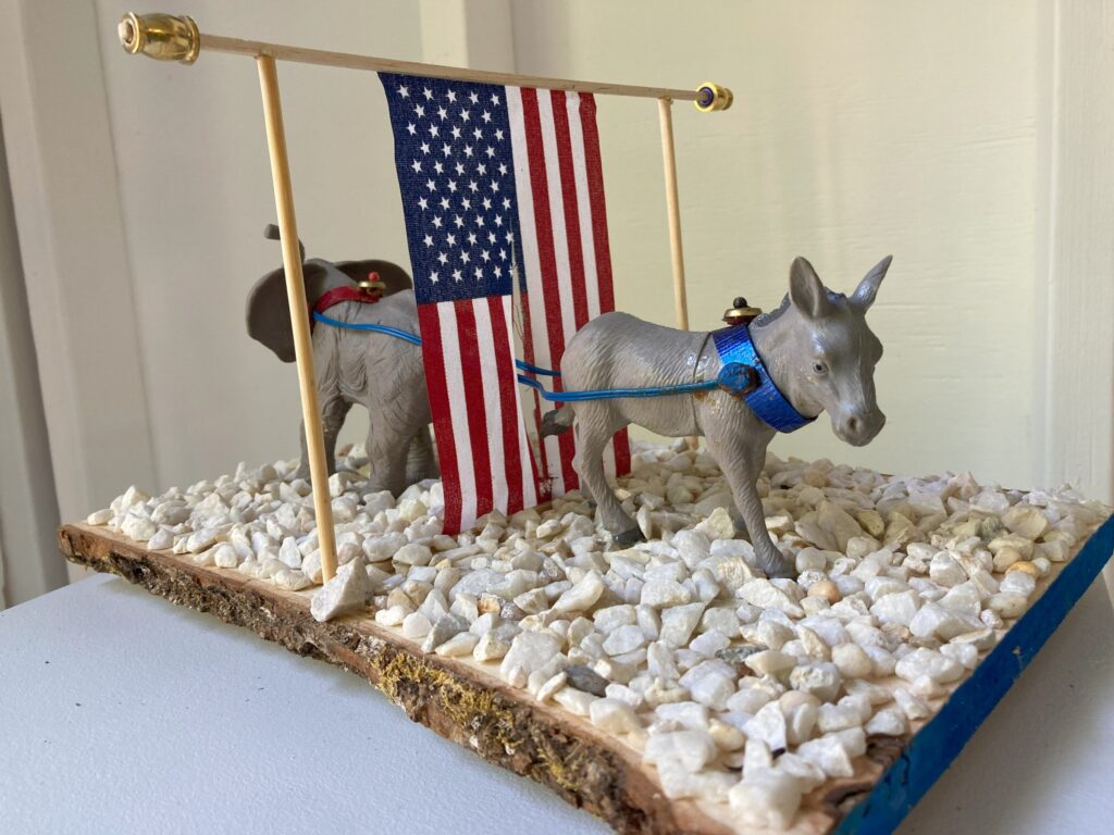 Of course, no Schön showcase would be complete without animals. Several sculptures featured in My Truth draw heavily on political iconography. Works depicting Democratic donkeys and Republican elephants are seen throughout the exhibition, often commenting on the lack of cooperation between the parties. For instance, United We Stand, Divided We Fall illustrates the erosion of political cooperation due to ever-polarizing parties by showing a donkey and an elephant engaging in a fierce tug of war, ripping an American flag in half.