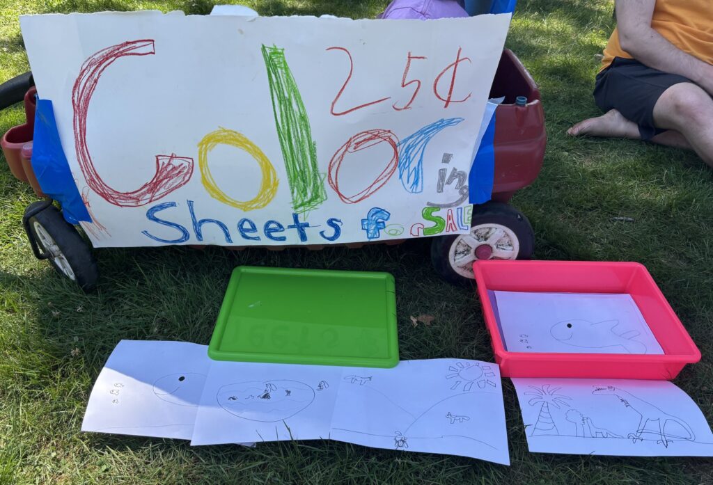Emily and Ian, who have been living in Newton for two years, have attended the July 4 events for as long as they have been residents. “The free ice cream got us out the door,” Emily said, “And once we got here, it became a fun event where we could mingle with many people.” Their daughter, Natalie, offered a small color sheet stand–25 cents per page–during Kids Morning, which she had been preparing for all year long.