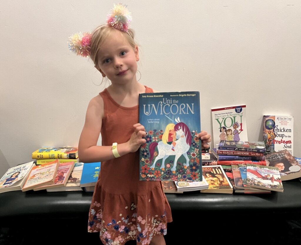 Cora Bayes, 5, was delighted with the free picture book she recently picked up, especially since it came with complimentary popcorn. She found her treasure at The Book Ladies’ Book Swap – a monthly event held upstairs at the West Newton Cinema, where bibliophiles can trade or simply take books, all at no cost.