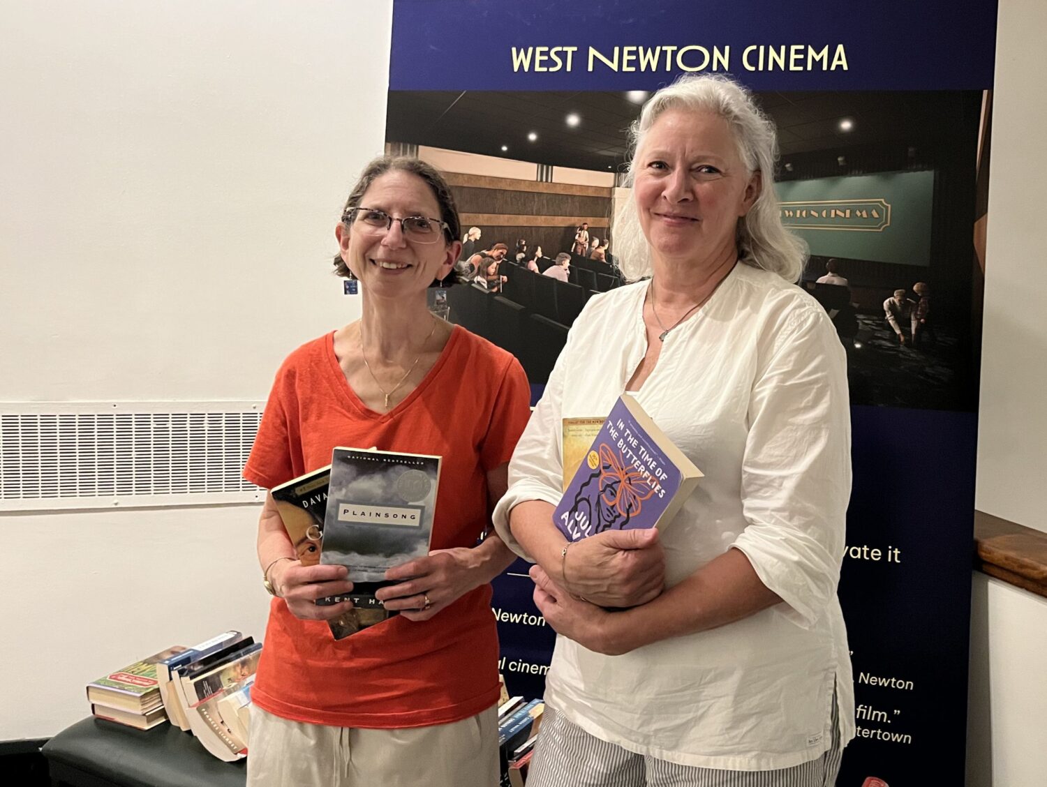 Jesse Cerrotti, manager of the West Newton Cinema, enjoyed the coffee and swaps at Flora’s. When he heard The Book Ladies needed a new location for their events, he readily offered the second-floor lobby space – plus tasty popcorn.