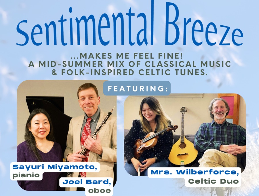 Sentimental Breeze is a very special, very breezy concert, featuring a mid-summer mix of Classical music & Folk-inspired Celtic tunes to get you feelin’ fine! It will feature performances by Sayuri Miyamoto, piano, Joel Bard, oboe, and Celtic Duo, Mrs. Wilberforce, consisting of Kyra Davies & Sean Smith.
