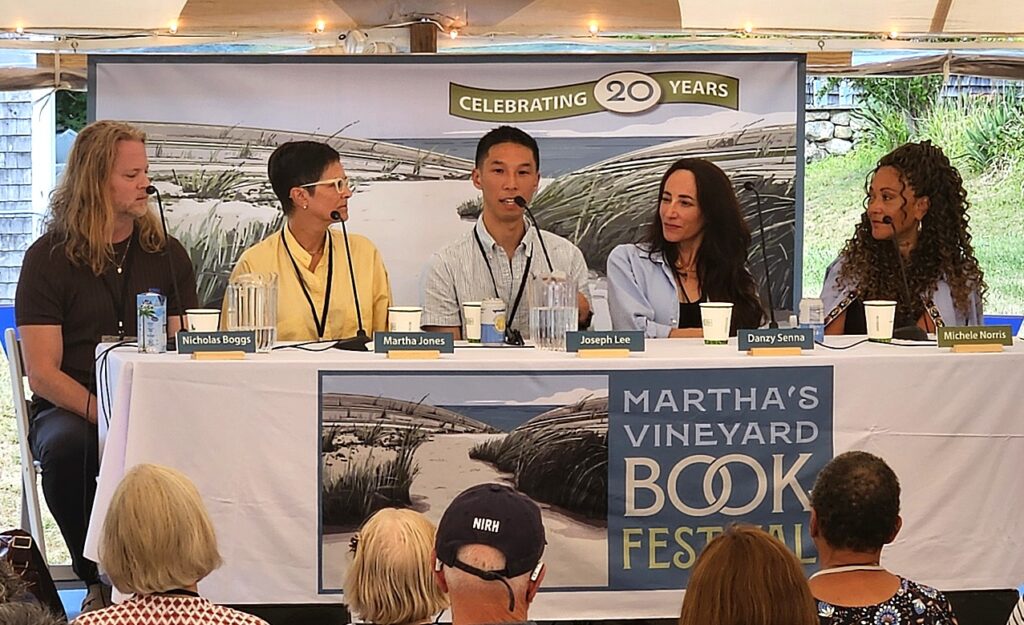 Joseph Lee (center), author of :Nothing More of This Land,” in panel discussion, “Out of Place in America: Marginalized Identities,” at the Martha’s Vineyard Book Festival (photo: Bruce Henderson)