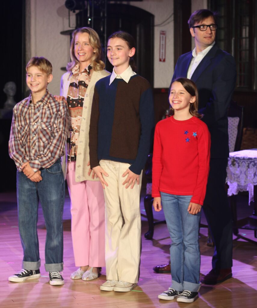 Drew Carozza as the younger brother John, April Pressel as the mother Helen Bechel, Elliot Sterns as the older brother Christian, Willow Cowin as Small Alison, and Thain Bertin as the father, Bruce, in NTC’s “Fun Home” (photo: Teresa Curtin)