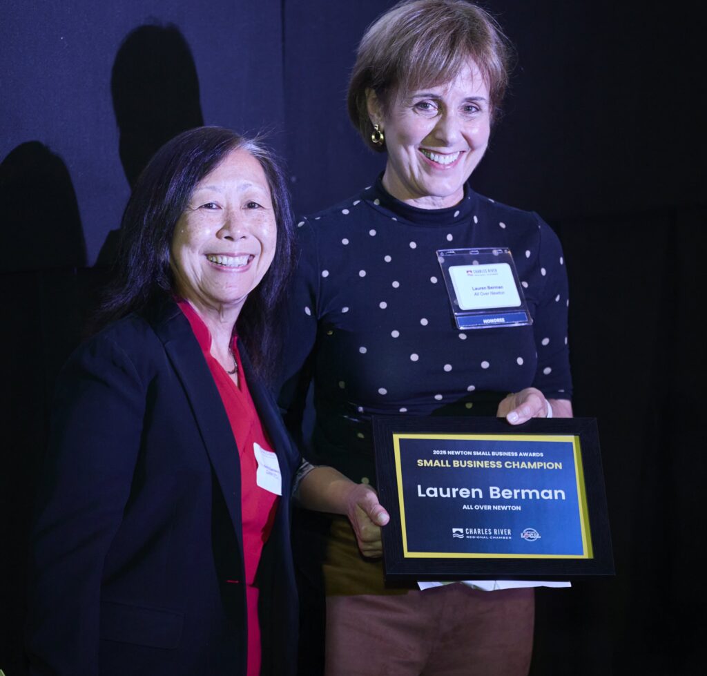 State Representative Amy Sangiolo presented the Small Business Champion of the Year award to Lauren Berman, founder of the marketing firm All Over Newton. During the pandemic, Berman found a creative way to help struggling businesses by putting her marketing expertise to work. She started by launching a website to connect people to local spots in Newton while telling their stories.
