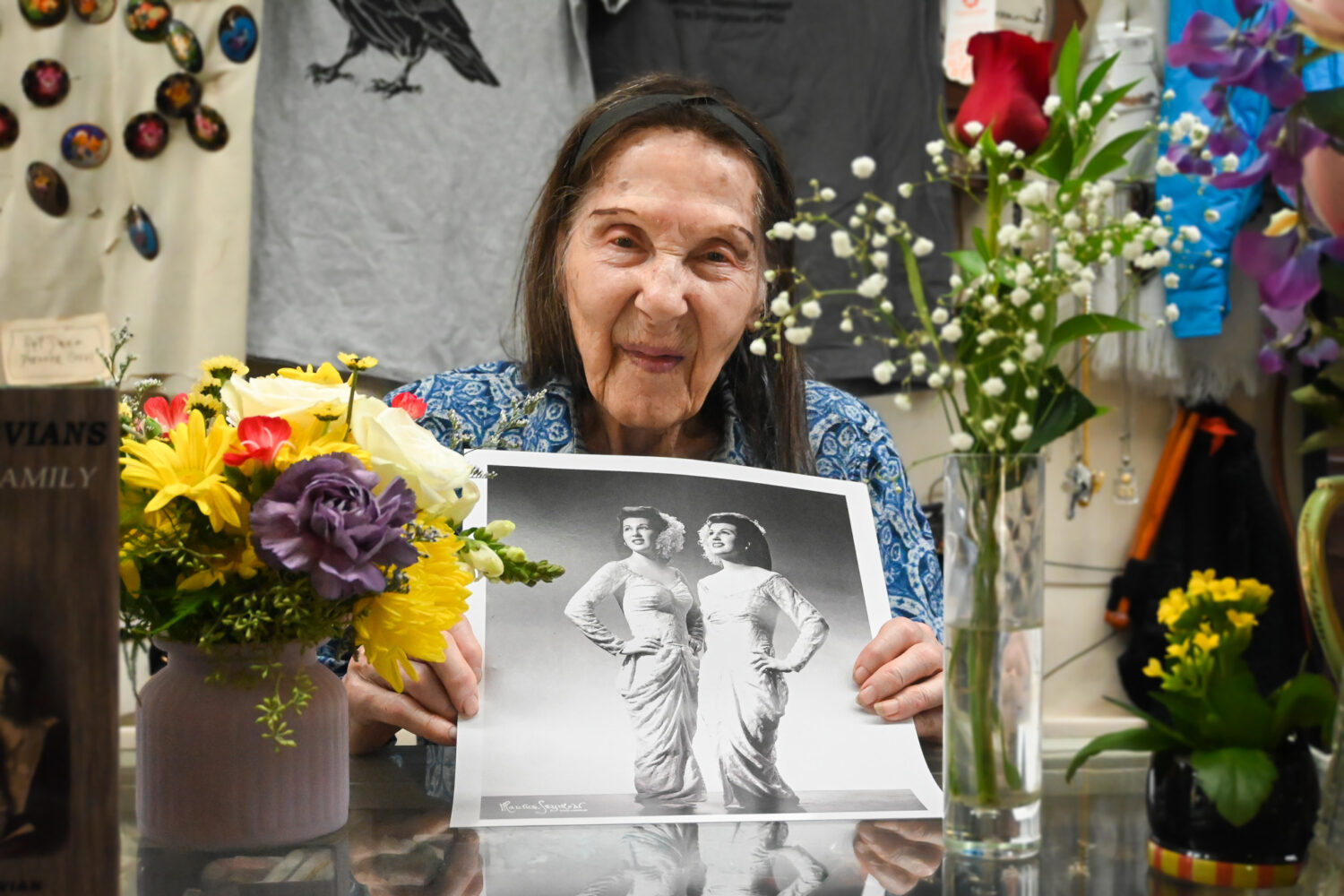 Patricia Bartevian on her 102nd birthday with gifts and a portrait of the Hickory Sisters (photo: Mina Rose Morales)
