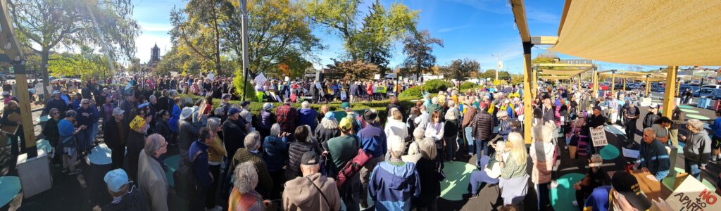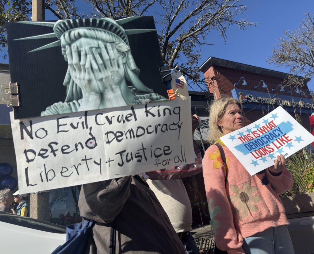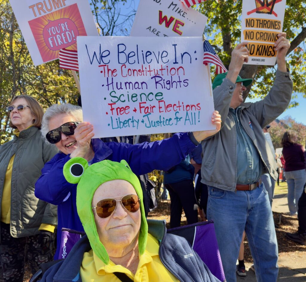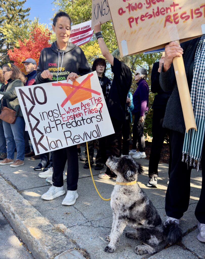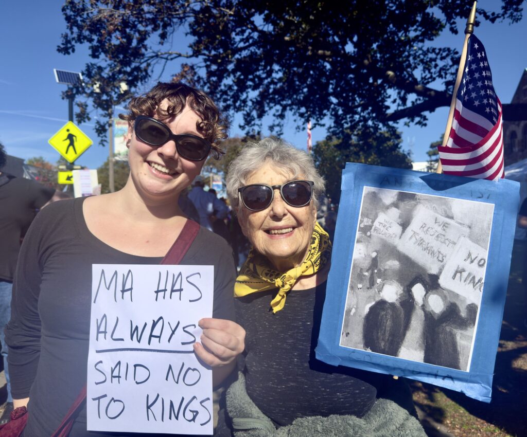 Upwards of 2,000 protesters filled Newton Centre Green on Saturday, October 18, for the second No Kings demonstration condemning the policies of the Trump Administration. The rally was one of more than 2,700 held nationwide, with organizers estimating roughly seven million participants across the country.