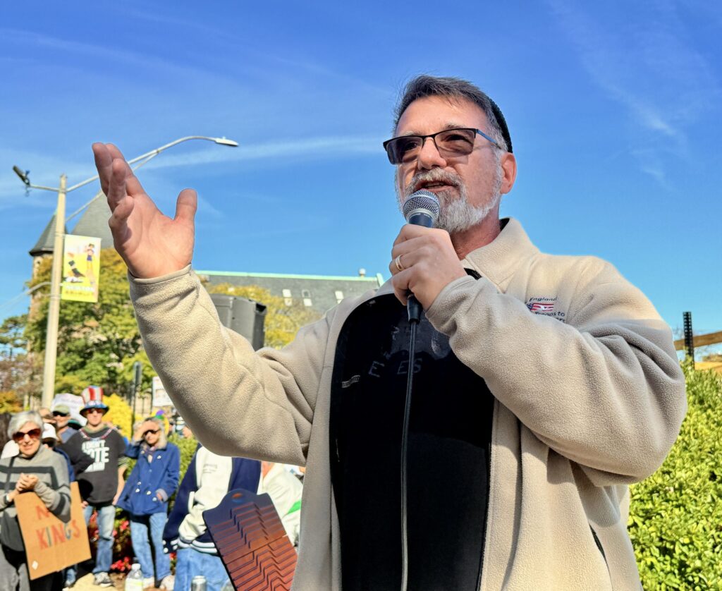 Ed Dube, a social studies teacher, union organizer, and veteran, spoke to the crowd, urging people to keep calling their local representatives until they take action.