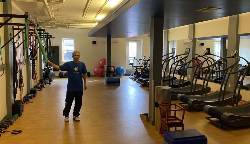 After the warm-up, classes alternate between short cardio intervals on manual treadmills or fan bikes and strength and balance circuits. Trainers constantly modify the exercises to match each participant’s level. “We guide people to go at their own pace,” Goodman said.