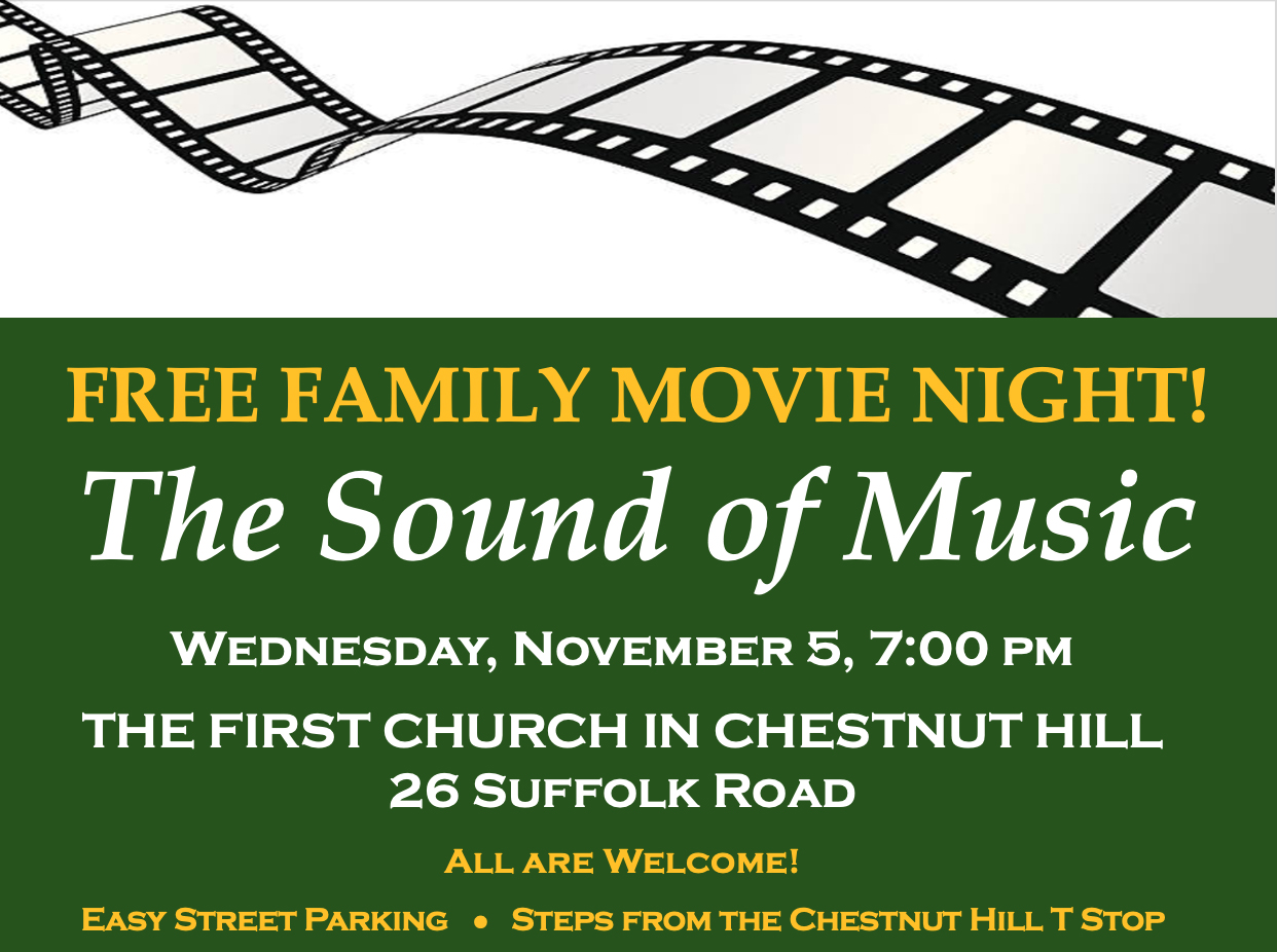 The First Church in Chestnut Hill will be showing The Sound of Music at their family movie night on Wednesday, November 5 at 7PM.
