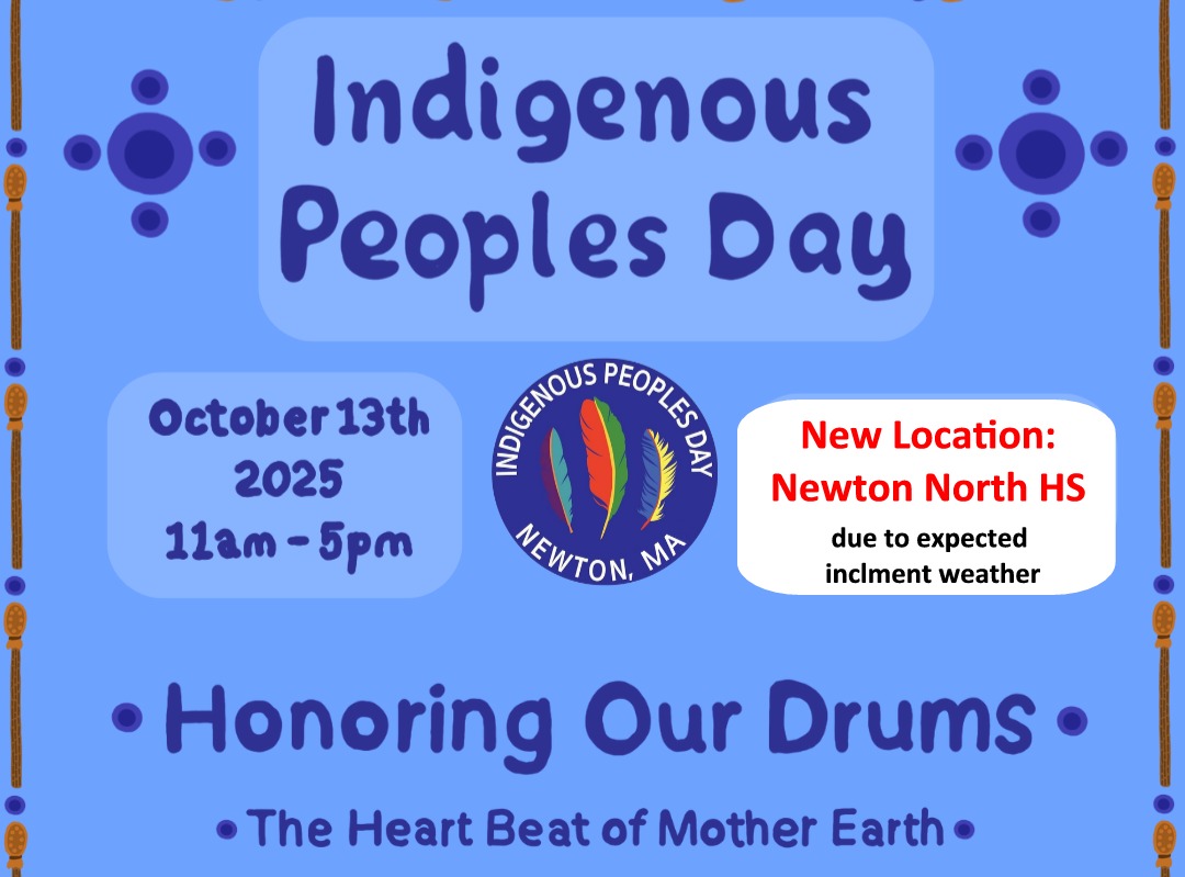 Newton’s 5th annual Ceremonial Celebration of Indigenous Peoples Day will be held on Monday, October 13 from 11AM to 5PM — NOT at Albemarle Field but at NEWTON NORTH HIGH SCHOOL (due to expected inclement weather).