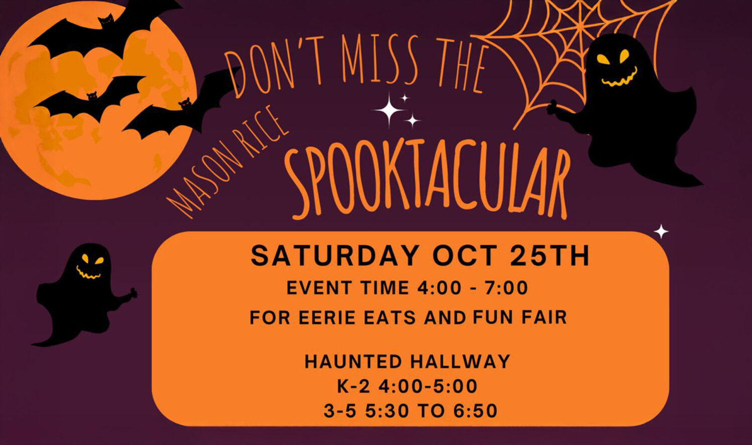 Mason-Rice Elementary School presents Spooktacular, Saturday October 25, 4-7PM. Tickets at the door, but skip the line and purchase pre-sale tickets by midnight Friday, October 24. All proceeds benefit the fifth grade’s graduation.