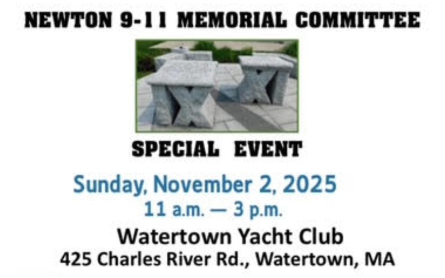 The Newton 9-11 Committee will host a Memorial Special Event at the Watertown Yacht Club (425 Charles River Rd., Watertown) on November 2, 11AM-3PM.