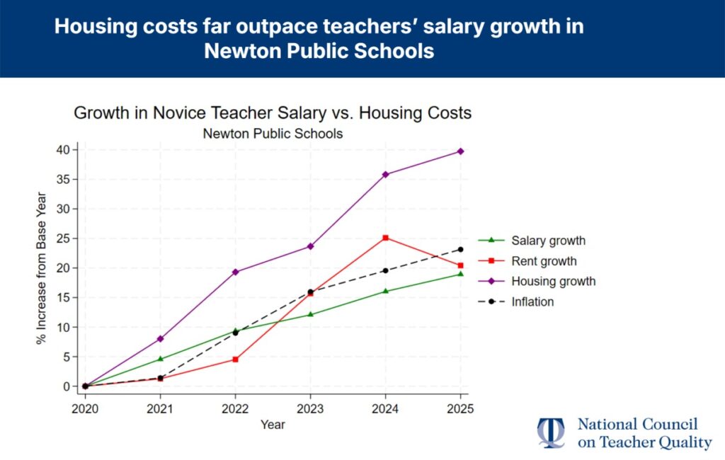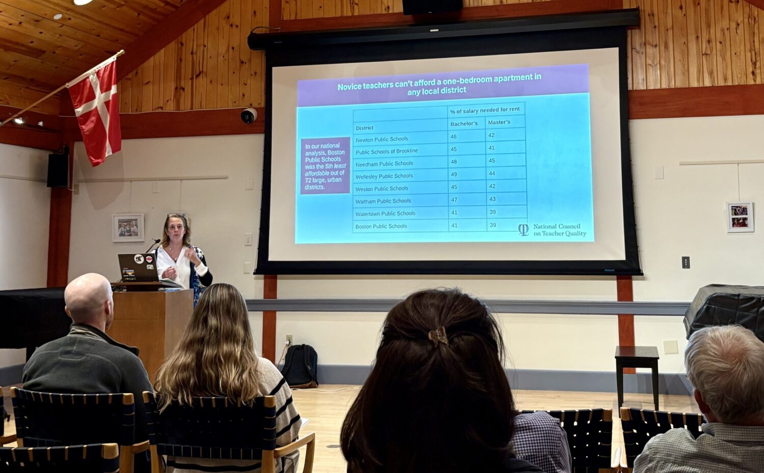 Newton for Everyone held a forum on “the growing challenge of teacher retention and housing costs” on Tuesday, September 30. Heather Peske, President of the National Council on Teacher Quality (NCTQ), presented Newton-specific data on the challenge public school teachers face trying to purchase or rent in the city. NCTQ research found local housing costs increased by roughly 40%, while teacher salaries increased by 20%. To purchase a house in the city, a Newton teacher with 25 years of experience would need to spend half their income on the mortgage, after having saved for the 20% down payment. (The study used the Zillow Home Value Index, which “reflects the typical value for homes in the 35th to 65th percentile range” for Newton home prices.)