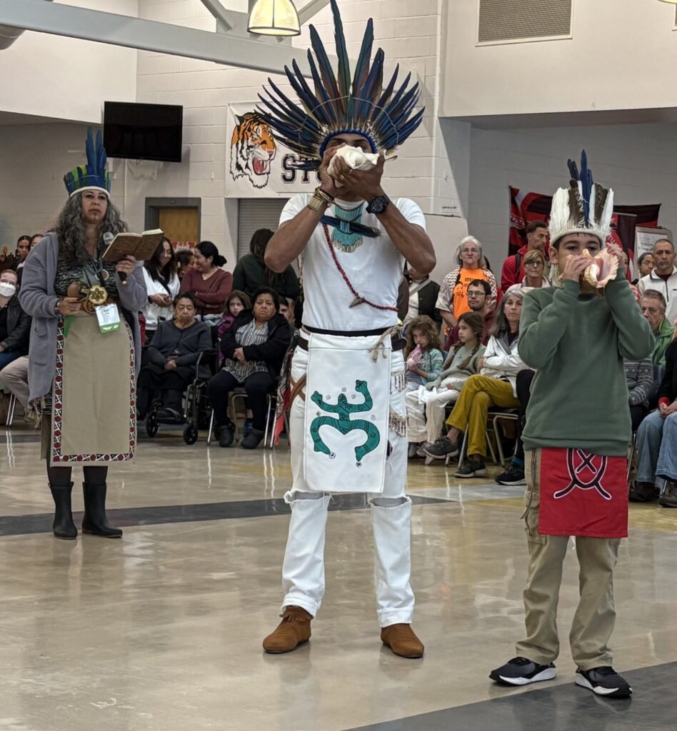 During the Call to the Seven Directions prayer, Dr. Darlene Flores, who is Taíno and a resident of Newton, accompanied Cito Bairaniki Colón, who blew the conch shell, the guamo. Dr. Flores’s son, Zamir Ali Nieves-Flores, is a Newton middle school student and joined in by blowing the guamo to call in the sacred directions as a Taíno Native American.