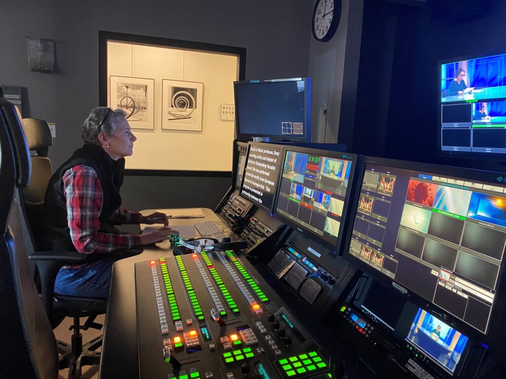 News Director Jenn Adams sits in the control room monitoring the prompter and taking notes. (photo: Charlie Johnson)